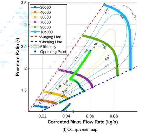 Figure 5f illustrates the compressor performance map as part of the fuel cell system designed for altitudes ranging from 0 to 3000 m. In this study, the compressor model has been analyzed across a range of rotational speeds, spanning from 30,000 rev/min to 105,000 rev/min. The characteristic behavior of the compressor is represented by the characteristic curve, which consists of multiple curves obtained by varying the rotational speed. The surging line and the choking line bound these curves. The surge line defines the minimum stable flow rate through the compressor. Operating near or beyond this line can cause backflow and pressure oscillations, leading to potential system instability or damage. On the other hand, the choking line represents the maximum flow capacity of the compressor at a given pressure ratio. Beyond this line, the mass flow rate cannot increase, even with a reduction in the pressure ratio. Contours between the surging and choking lines correspond to interpolated iso-efficiency lines, indicating regions of constant efficiency. In the present study, interpolated efficiency surfaces were implemented in the compressor model to achieve accurate predictions of compressor performance. Furthermore, with the inclusion of operating points, as shown in Figure 5f, this study enables the determination of compressor efficiency values.