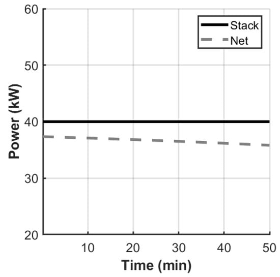 As demonstrated in Figure 6, net power and stack power are compared over time. It is evident that net power is lower than stack power due to the power consumption of auxiliary components, particularly the compressor, which ensures an adequate oxygen supply for the fuel cell system. As previously mentioned in Section 3.1, given that the current demand and voltage output remain almost constant, the stack power follows a steady trend over the simulated period. In contrast, net power gradually decreases due to the increasing power consumption of the compressor motor in the air supply system.