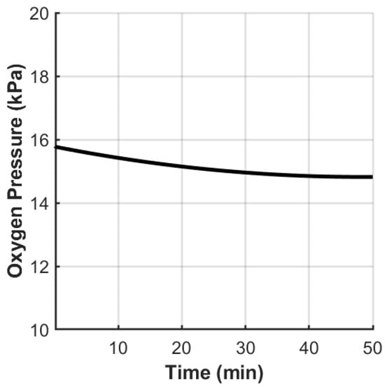 Figure 8 illustrates the oxygen partial pressure in the cathode of the fuel cell system over time. It is clear that, with increasing altitude, oxygen pressure gradually decreases throughout the time interval due to oxygen starvation at higher altitudes.