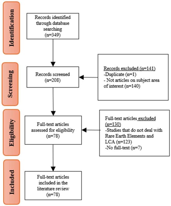 The final sample consisted of 78 records subjected to content analysis [27,28]. Content analysis involves systematically reviewing the texts to identify key findings, recurring themes, and trends in the analysed sector. This methodology allowed for a more in-depth interpretation of the data [29]. The analysis of these articles aimed to extract information regarding the environmental, economic, and social impacts of REE production and technologies, focusing on the potential of secondary sources and the integration of emerging digital technologies in production and recycling processes. No data transformations or statistical conversions were applied during the synthesis phase. Only explicitly reported data were extracted from each study. Studies with missing core methodological or outcome information were excluded during the full-text screening phase to ensure consistency and reliability in the content analysis. The findings were synthesised and organised into thematic categories through content analysis to identify recurring patterns, research gaps, and sustainability dimensions related to REE production and recycling. These themes are further developed and discussed in the Results section. This method was chosen due to the heterogeneity of the included studies in terms of the research design, objectives, and indicators used. Conceptual variation among studies was explored by grouping them thematically according to their focus on key aspects of REE production and sustainability. This approach allowed for the identification of shared patterns and differences across studies in terms of methodologies, sustainability dimensions, and technological perspectives. To ensure transparency and replicability, the review process followed the PRISMA (Preferred Reporting Items for Systematic Reviews and Meta-Analyses) framework [15]. PRISMA provides a structured approach for conducting systematic reviews, offering a flowchart outlining the study identification, selection, and inclusion process. This ensures that all relevant studies are considered and the selection process is transparent and traceable. Figure 1 illustrates the PRISMA flowchart, which details the various stages of the review process, including the records identified, duplicates removed, screening results, and final study inclusion.