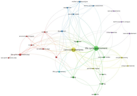 To analyse the most recurring keywords, the authors used the VOSviewer software (version 1.6.19). Figure 3 represents a co-occurrence map generated by VOSviewer, using a bibliographic dataset related to scientific production on rare earth elements LCA. The connections between the terms show the relationships between different keywords used in scientific articles, with the lines representing the strength of the links (co-occurrences) between them. Larger nodes indicate keywords with a higher frequency of use in the literature, while the colours identify thematic groups or research clusters [30]. The authors only used keywords repeated at least three times. The analysis produced 199 keywords and 53 keywords that met the inclusion criterion. The software identified six clusters.