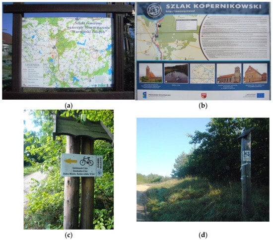 Dobre Miasto municipality also features other tourist trails and routes, which are available to visitors from various age groups. Most trails are very well marked (Figure 2a–d). Seven cycling routes in the municipality have been designed and developed by the Warmiński Zakątek (Warmian Corner) local activist group.