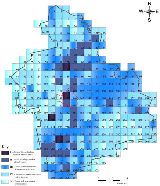 Each reference square was assigned to a specific group (A, B, C, D, and E) based on the sum of the scores obtained in all partial assessments, where group A denoted areas with the highest tourism attractiveness (the highest availability of special-interest tourism resources) and group E denoted areas with the lowest tourism attractiveness (the lowest availability of special-interest tourism resources). The scores allocated to each attractiveness group are presented in Table 4.
