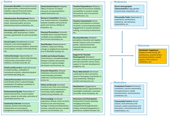 Residents’ well-being is influenced by various factors related to tourism, each with its distinct impacts (Table 1). Economic benefits, such as increased employment and income, contribute to financial stability, reducing stress and enhancing life satisfaction. Cultural exchange through tourism provides opportunities for residents to engage with new ideas and practices, fostering a sense of global connectedness and enriching their lives. Infrastructure development, including improvements in roads, healthcare, and recreational facilities, enhances residents’ quality of life by providing better access to essential services and leisure activities. Strengthening social capital and community cohesion through tourism builds trust and cooperation among residents, further enhancing well-being. However, negative factors such as stress from overcrowding, resource competition, and economic disparities can detract from residents’ well-being. These factors highlight the importance of a comprehensive approach to tourism development that considers both the positive and negative impacts on local communities, ensuring that tourism contributes meaningfully to the overall well-being of residents [18,39].