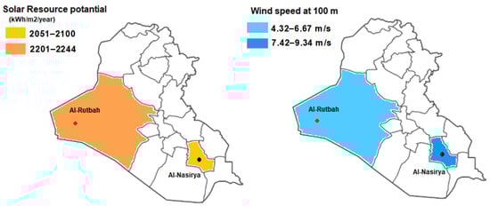 This section describes the main research strategy and the techniques used in the study, namely the feasibility of a hybrid solar photovoltaic and wind power station in Al-Rutbah and Al-Nasiriya in Iraq. The analysis evaluates key technical factors, such as resource availability, system design, and integration challenges, alongside financial considerations, including capital costs, operational expenses, and return on investment (ROI), using the RETScreen program. The models were subjected to a measurement program, which will be described further in the section. The entire numerical analysis is discussed, including change in the hybrid plant’s design and how the changing location affects performance, a description of the features of the hybrid PV and wind plant analysis utilized, and an uncertainty analysis. Figure 1 shows the selected Iraqi locations and the characteristics of the atmospheric conditions [26,27], such as solar resource potential and wind speed for Al-Rutbah and Al-Nasiriya.