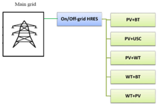Structural scheme of PV + WT on grid, off-grid, and scenario.