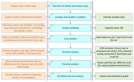 RETScreen Expert is a comprehensive Clean Energy Management Software platform designed to assist professionals and decision-makers in assessing the feasibility of energy efficiency, renewable energy, and cogeneration projects. It also enables users to monitor and verify the ongoing energy performance of buildings, power plants worldwide, and factories, as well as manage entire portfolios of facilities [7]. Developed by international collaborators, a wide range of researchers utilized the software in design for different projects. Additionally, RETScreen is an educational and research tool that is referenced in academic research. In this analysis, RETScreen version 8.1 was used. RETScreen Expert offers comprehensive modeling for a wide array of clean energy sources, both traditional and non-traditional, alongside conventional energy sources and technologies. This includes energy efficiency solutions ranging from large industrial setups to individual homes and diverse heating and cooling methods like biomass, heat pumps, and solar air/water systems. It also covers power generation from renewables such as solar, wind, wave, hydro, and geothermal, in addition to conventional technologies like gas and steam turbines and reciprocating engines. The platform supports combined heat and power systems, or cogeneration [7,8]. Users can access integrated databases for products, projects, benchmarks, hydrology, climate data, and links to global energy resource maps within their analytical worksheets.