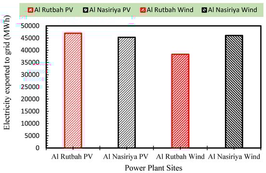 Figure 6 compares the total electricity exported to the grid (in MWh) by the combined photovoltaic (PV) and wind power projects at two locations: Al Rutbah and Al Nasiriya. The total electricity exported ranges from 82,000 MWh to 92,000 MWh for the two power plant sites. The results record that the Al Nasiriya project (PV + Wind) exported the highest amount of electricity, approximately 91,500 MWh, indicating a strong overall performance of both renewable sources at this site. In contrast, the Al Rutbah project (PV + Wind) exported around 85,000 MWh, which is noticeably lower than Al Nasiriya’s output. This suggests that the Al Nasiriya site has a more favorable environment, better system efficiency, or both, for renewable energy generation when combining PV and wind technologies. The difference in export levels may be due to site-specific factors such as solar irradiance, wind speed, infrastructure efficiency, or grid integration capabilities.