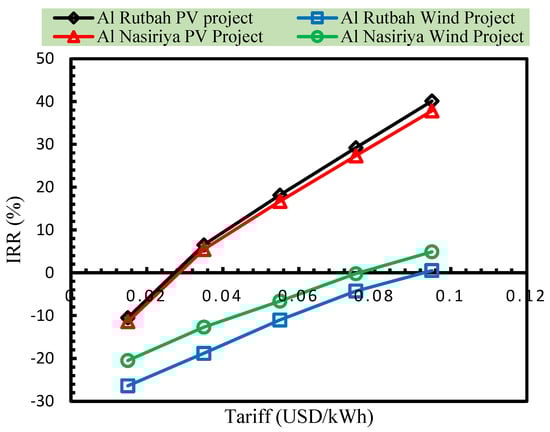 The Internal Rate of Return (IRR) variation for solar photovoltaic and wind power projects at the Al-Rutbah and Al-Nasiriya sites.