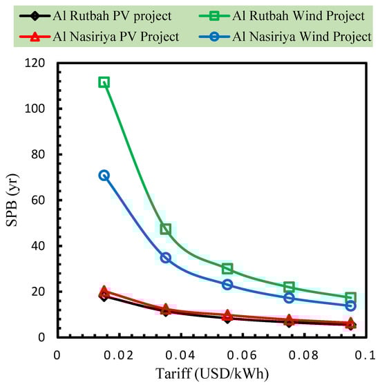 The variation in SPB for solar photovoltaic and wind power projects at the Al-Rutbah and Al-Nasiriya sites (Scenario 2).