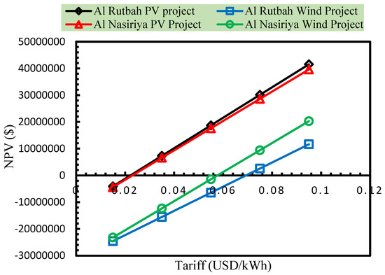 The Net Present Value (NPV) variation for solar photovoltaic and wind power projects at the Al-Rutbah and Al-Nasiriya sites.