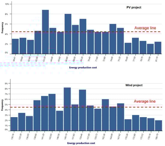 Figure 11 presents the probabilistic distribution of energy production costs for both the PV and wind power projects, derived from risk analysis simulations. The variation in the PV project reveals that the energy production cost predominantly lies within the range of approximately 63.20 to 66.80 USD/MWh, with the highest frequency observed around 63.20 USD/MWh. This concentration suggests relatively stable cost behavior and moderate sensitivity to input uncertainties such as initial investment, O&M costs, and energy yield. The cost distribution for PV is narrower and skewed slightly right, indicating a more predictable and manageable risk profile. Conversely, the wind project exhibits a broader and more dispersed cost distribution, ranging roughly from 132.76 to 180.79 USD/MWh. The cost frequency is highest in the 149.9 to 151.83 USD/MWh range, but several bins show significant frequencies across a wider cost range, reflecting higher sensitivity to uncertainties. The wider spread indicates that wind energy production costs are more volatile and risk-prone due to higher initial costs, O&M variability, and fluctuations in wind energy yield.