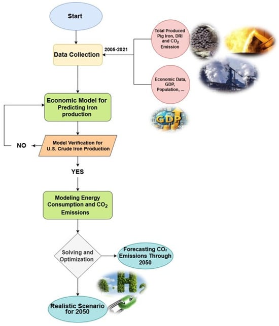 Based on the collected information, we calculate the amount of iron production for the specified period (2005–2050) using the linear economic model explained in Section 2.1. Then, we compute the total carbon emissions, including both the carbon consumed during the iron production process and the carbon emitted from electricity generation. This electricity is consumed throughout the ironmaking processes. The flow diagram of the proposed model for carbon dioxide emission prediction is displayed in Figure 1.