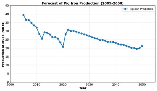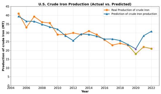 Figure 3 shows the results of the proposed model for crude iron production through 2025. While Figure 3 depicts a slight decrease in crude iron production by 2025, this does not necessarily indicate a shortage of steel. The decrease—potentially caused by factors such as a shift toward more efficient steel production methods that use less crude iron, like electric arc furnaces (EAFs) relying on scrap steel [43], and stricter environmental regulations—reflects broader production trends.