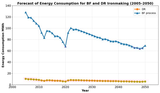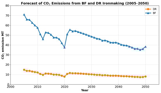 The current production of crude iron—considering a production rate and implementation rate of 10,000 MT/day and 95% for the BF process [14,44]—accounts for approximately 70%. Additionally, the production rate and implementation rate of 3600 MT/day and 95% for the DR process account for approximately 30% [15]. Assuming no further development in crude iron production by 2050, the CO2 emissions during this period can be plotted in Figure 4. This figure illustrates that emissions from the DR process are much lower than those from the BF process; however, the production and implementation rates of the DR process are lower than those of the BF process. Since the DR process consumes natural gas, its associated CO2 emissions are lower than those of the BF process, which consumes coke.