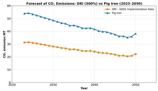 If we hypothetically assume that, in the future, all crude iron production could be achieved using the DR process with an implementation rate of 300% (i.e., exceeding the current capacity), the CO2 emissions from this scenario could potentially be plotted as shown in Figure 6.