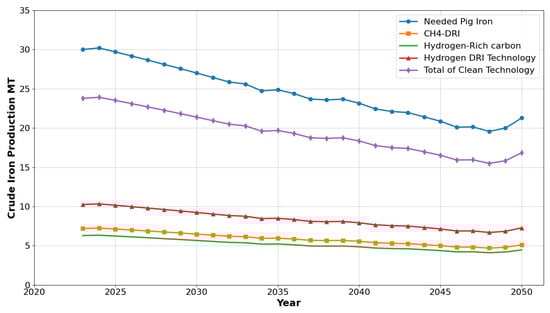 Looking beyond the scenario of full DR process adoption, it is important to consider a broader range of potential technological advances and implementation trends in crude iron production. Among these are innovations such as the use of clean energy carriers—like hydrogen gas (H2) or plasma hydrogen—as part of the reduction process [21,40].