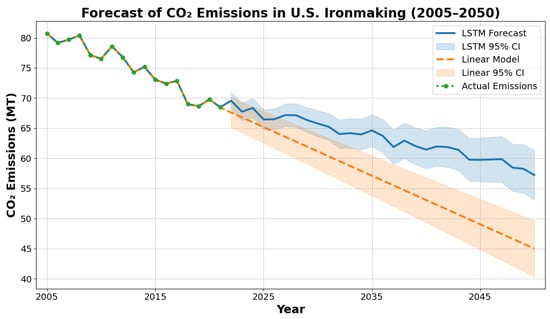 Forecast of CO2 emissions in U.S. ironmaking from 2005 to 2050 using LSTM and linear regression models. Shaded regions represent 95% confidence intervals for each model, reflecting increasing uncertainty over time. The LSTM forecast captures a more gradual and variable decline in emissions, while the linear model projects a steady downward trend. Historical emissions data (2005–2021) are included for reference.