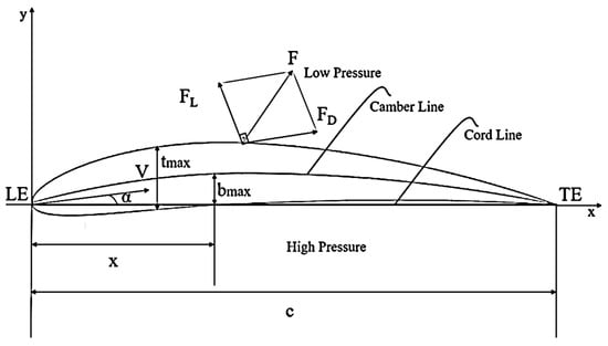 Before proceeding to the optimization process, it is necessary to define the NACA airfoil to be studied along with its geometric and aerodynamic parameters. The general representation of the aerodynamic forces acting on an airfoil and the basic profile parameters is shown in Figure 1 [25]. The fluid enters the airfoil from the leading edge (LE) and exits from the trailing edge (TE). The force component created in the direction of flow is the drag force (FD), defined by Equation (1), while the force occurring perpendicular to this is the lift force (FL), expressed by Equation (2). The lower pressure on the upper surface and relatively higher pressure on the lower surface of the airfoil result in the generation of a lift force.