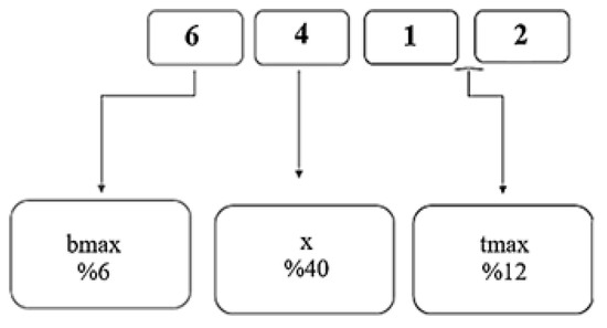 In NACA 4-digit series, the first digit (A factor) represents the maximum camber ratio (bmax, %) of the profile [28]. For example, in the NACA 6412 profile, this ratio corresponds to 6% of the chord length (Figure 2). In the literature, it was observed that the 6% camber ratio (A factor—level 2) is commonly used, while studies related to the values of 5%, 7%, and 8% (A factor—levels 1, 3, and 4) are limited.