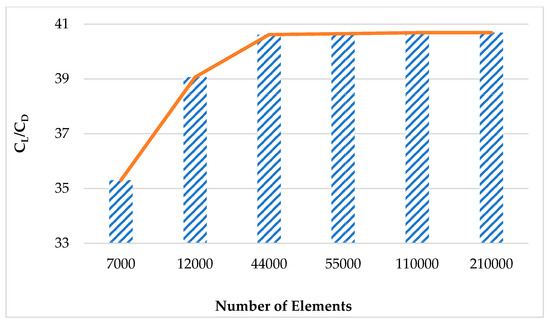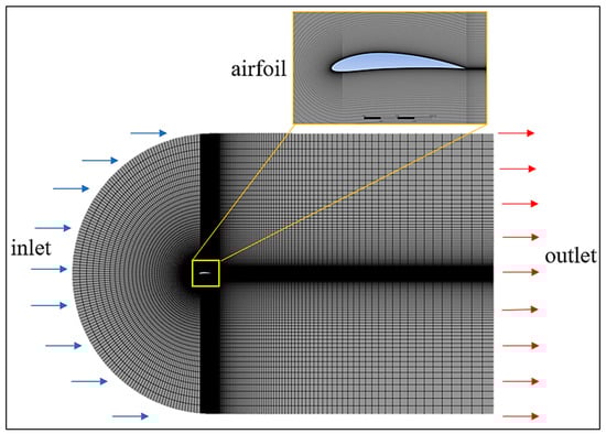 For the validation study, the reference study [29] selected the flow parameters of the NACA 0012 and NACA 6412 airfoils, which were obtained and compared using different methods: CFD and experimental (PIV). Since the optimization of the NACA 6412 airfoil was the goal of this study, a validation study was conducted using the geometry and mesh model of the NACA 6412 airfoil under the analysis conditions given in Table 3. The flow domain was modeled as a C-type. The mesh structure was created with the optimum number of elements (around 64,000) determined by the reference study (Figure 3).