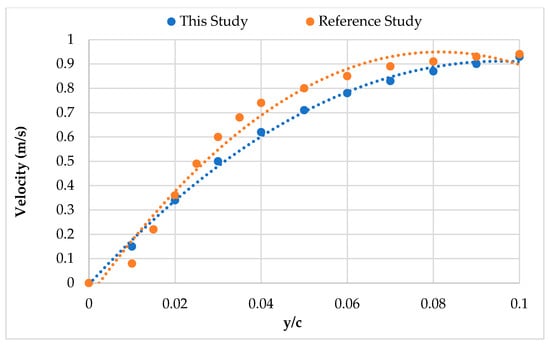 In the reference study, four different positions were determined for the NACA 6412 airfoil, and the velocities in the x-direction at these positions were normalized by the chord length and compared along the y-axis in a way suitable for comparison with other methods. In this study, the first of the four positions for the NACA 6412 airfoil was used as a reference, and the results obtained were compared with those from the reference study. Accordingly, the velocities in the x-direction at the first position of the NACA 6412 airfoil were found to be the same in both studies (Figure 4).