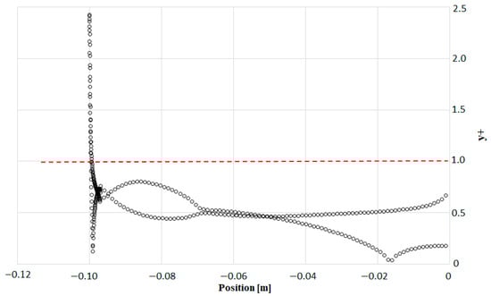 Boundary conditions were modeled similarly to the validation study, with a velocity inlet at the entrance, a pressure outlet at the exit, and a no-slip wall condition on the blade surface. To successfully model flow separations in all simulations, the k-w SST turbulence model was used. Convergence was achieved with a precision of 10−6 while ensuring the y+ < 1 condition (Figure 6). Figure 6 shows the variation of the y+ value along the airfoil surface with respect to position. Initially, particularly around 0.1 m, the y+ value exceeds 2.5, which may indicate insufficient mesh resolution in the entry region or the presence of sharp velocity gradients.