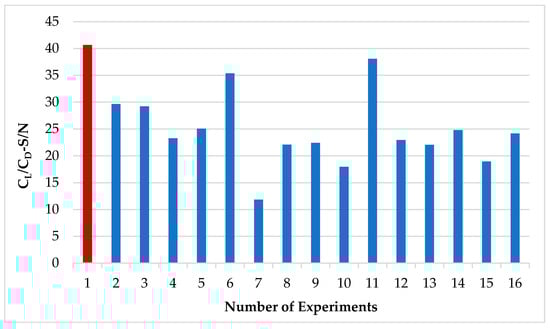 In the Taguchi Method, a total of 16 analyses were performed according to the L16 (21 × 44) series. The first experimental analysis has the folloblade parameter combination: maximum camber: 5% (A-1), maximum camber position: 30% (B-1), angle of attack: 12° (C-3), Maximum thickness: 8% (D-1), Free stream velocity: 15 (E-1). This configuration has both the highest S/N ratio and the highest blade performance ratio. The S/N graph based on the performance ratio of the experiments is shown in Figure 7. As a result of the analyses, the first experiment (5308) achieved the highest S/N ratio.