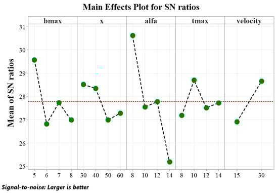 To evaluate the effects of the factors within their respective levels, it is necessary to examine the main effects through the averages of the S/N ratios. This method allows for identifying the differences between the levels of each factor. An increase in the slope between levels indicates that the effect of the factor on the results is more pronounced. The differences between the levels of the factors are shown in detail in Figure 8.