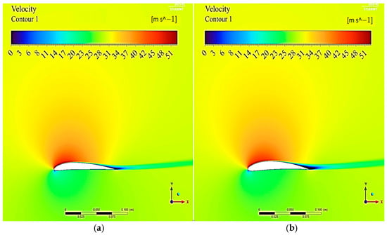 Velocity contour comparison of the new airfoil 5310 (a) and NACA 6412 (b).