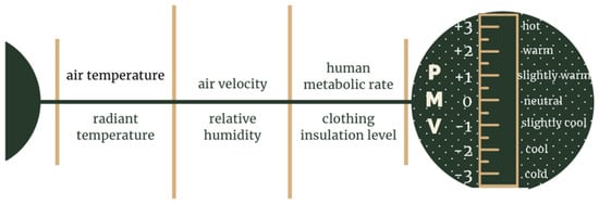 The development of the Predictive Mean Vote (PMV) model was a significant milestone in thermal comfort research [34,35]. Predicted Mean Vote (PMV) represents the mean thermal comfort level on a standard scale, mathematically predicted for a group of building occupants based on the combination of air temperature, radiant temperature, air velocity, relative humidity, human metabolic rate and clothing insulation level in a room [36]. The calculated result predicts the thermal sensation of the room’s occupants via a range of numbers between −3 (cold) and +3 (hot), where the optimal thermal comfort level is 0 (neutral), as shown below in Figure 1.