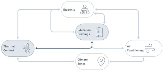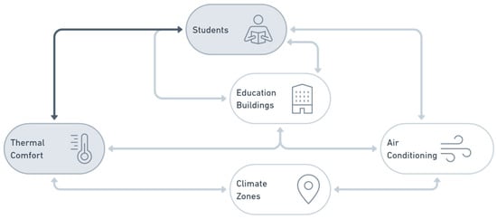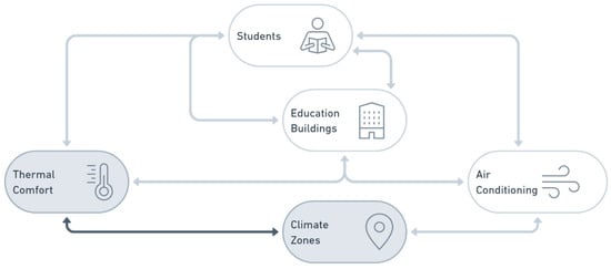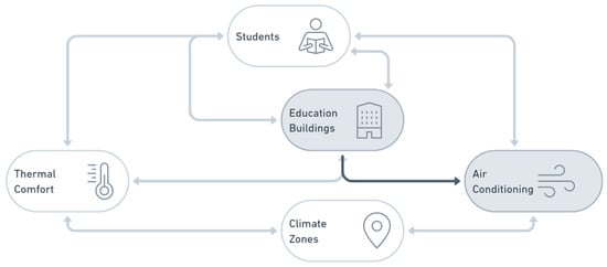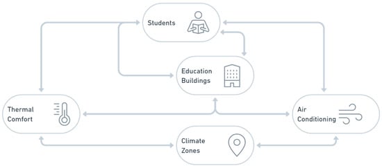 The systematised review identifies research gaps and demonstrates the current knowledge and insights within the field by collecting and analysing evidence from the literature that is available on the topic. To provide a comprehensive snapshot of academic research and the current state of the art for thermal comfort requirements for educational facilities, the preliminary review of the literature has identified the interlinked relationships between key areas that impact the situation of thermal comfort in classrooms, which can be summarised as climate zones, education buildings, students, thermal comfort and air conditioning (Figure 2). For this study, we include studies on primary, secondary and tertiary students who learn in government or private classrooms. The indoor classrooms can be of any type, single or multi-storey, permanent or relocatable/demountable. Our consideration of air conditioning means mechanical heating or cooling systems, such as heating, ventilation and cooling (HVAC) systems like air conditioners, chillers or evaporative coolers. If simple mechanisms like operable windows and fans are used, these are noted as natural ventilation.