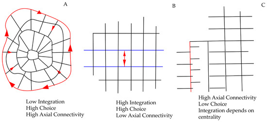 Examples of spatial metrics of integration, choice, and axial connectivity. (A) Ring road in red has a peripheral position with low integration, red arrows trace the hight choice and the black radial lines show many direct intersections with high axial connectivity. (B) Central narrow alley connects to two main streets represented blue. (C) Suburban cul-de-sac street with high axial connectivity.