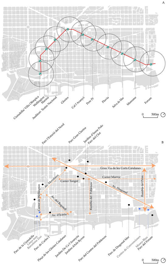 The Trambesòs stations were analysed with a 500-m radius (Figure 2A), and the main streets and public spaces are depicted in Figure 2B. The map presents the set of neighbourhoods traversed by the Trambesòs tram line, namely Villa Olímpica de Poblenou, El Poblenou, Diagonal Mar I el Front Marítim del Poblenou, El Parc i la Llacuna del Poblenou, Provençals del Poblenou, and El Clot, which have been part of urban regeneration initiatives. This area was part of the redevelopment of the seafront and the implementation of the 22@ innovation districts [71], both reshaping the spatial and functional dynamics of the area. The area illustrated in Figure 1B along the Trambesòs tram line reflects the orthogonal urban fabric of San Martí, characterised by a mix of residential, cultural, recreational, and institutional uses.