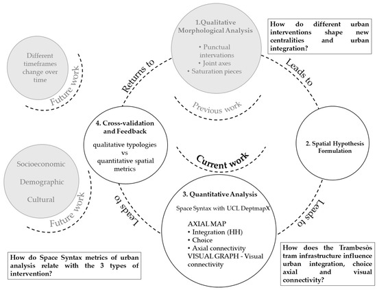 To synthesise the research process, Figure 3 illustrates the methodological workflow developed in this study. First, a qualitative morphological analysis identified and classified the existing intervention typologies. Building on this taxonomy, the second phase formulates spatial hypotheses about how each intervention type generates new centralities. In this study, these hypotheses are tested quantitatively using Space Syntax (UCL DepthmapX) to evaluate the spatial and morphological impact of tram-led transformations in terms of accessibility and urban cohesion. Forth, the cross-validation confronts the three types of typologies with the quantitative metrics. These analyses focus on the physical and functional restructuring of the Levante area of the Besòs River. This methodology can be extended by incorporating temporal dynamics, examining how intervention effects evolve across different timeframes and by integrating socioeconomic, demographic and cultural variables to capture broader dimensions of urban cohesion and resilience.
