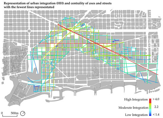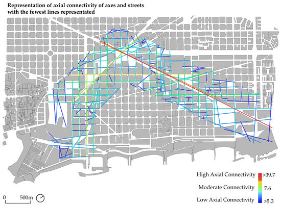 Axial map analysis was performed to predict flows, identify structural corridors, and evaluate spatial connectivity. This analysis is structured on the urban system through straight lines that describe the longest and most direct possible paths without visual interruptions and offers a configurational reading of the urban structure. The axial map analysis was performed in DepthmapX with a global radius (radius = n) to capture the full extent of topological relationships within the area of the Trambesòs line [21,66]. In this study, the analysis of articulation axes, i.e., streets, metrics, and axial maps were built from the fewest-line map (minimal) setup in UCL DepthmapX, which is the most conventional configuration for outdoor analysis (i.e., urban analysis). This process smoothens segmentations and counts by defining the axes as the longest straight lines in the study area [66]. Tram stations and the main public spaces were analysed using an all-line map setup in UCL DepthmapX, in which the axial metrics were defined as the average of the parameter values of the segments crossing the spot. This aims to avoid the assignment of axial metrics that represent a main street to specific spots; otherwise, by using the fewest-line map (minimal) setup, different spots on a street would end up having the same metrics. In this study, axial map analysis was performed using the following metrics: