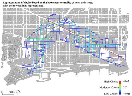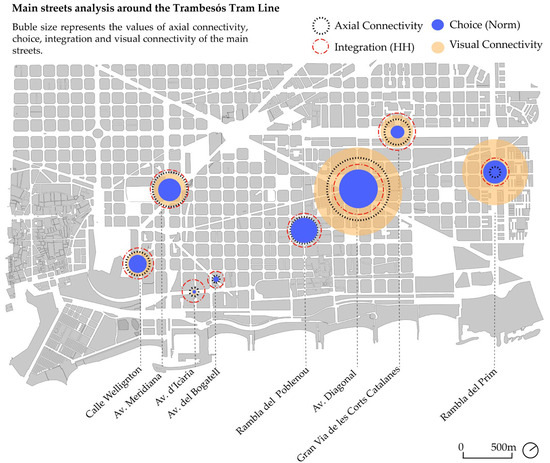 Axial map analysis using the choice metric represents the frequency with which each segment forms part of the shortest paths within the urban network (Figure 5). This metric identifies the axes of the urban fabric surrounding the Trambesòs tram line that are most likely to be used as part of the optimal trajectories. This indicator, associated with betweenness centrality, reveals that Avinguda Diagonal and Carrer Tànger/Carrer Marroc function as structural through-corridors within the mobility system of the Trambesòs area of influence. The highest choice values were obtained for both streets, followed by Av. Meridiana concentrates potential flow and acts as a bridge between different urban sectors. Streets with open public spaces associated with or near saturation pieces present a high value. In contrast, the lowest choice values were observed in most of the other streets around the Trambesos tram line. Calle Wellington and Rambla del Prim present low values due to the peripherical location, which indicates a reduced role within the optimal paths of the network. These differences further support the hierarchy outlined above and form the basis for the overall analysis in Section 4.2.
