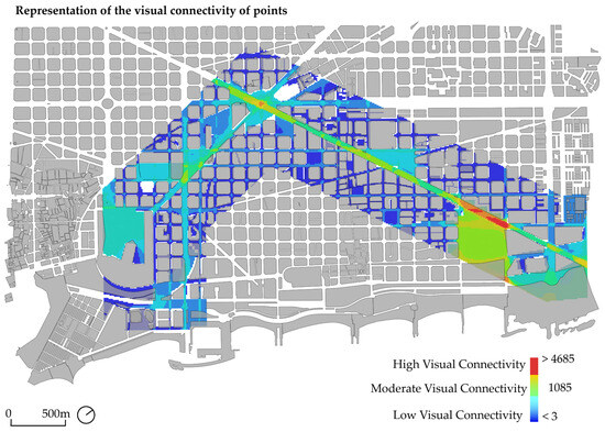 In addition, VGA was applied to assess visual accessibility and spatial perception in areas adjacent to the tram alignment. The VGA allows for the evaluation of the visual and pedestrian-scale properties of the visibility network and provides insight into how the spatial configuration can influence permitted movements [68]. It examines the visual properties of space based on isovist fields, which represent what is visible from a specific point. This method is particularly suited to architectural environments where spatial experience is shaped by visual exposure and intervisibility rather than movement paths. VGA was performed using the following metric: