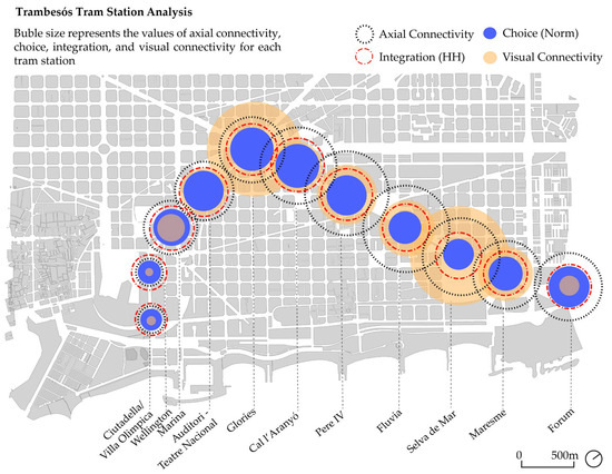 Integrated map of Space Syntax metrics from UCL DepthmapX. Integrated visualisation of axial integration, visual connectivity, and choice values for the Trambesòs tram stations are represented by the bubble size.
