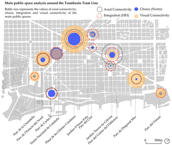 The transformation of the Levante del Besòs area has been accompanied by interventions that reclaim public spaces and promote pedestrian and cycling mobilities. This integrates the tram into a wider multimodal transport system categorised by punctual interventions and saturation pieces. Figure 10 and Table 4 shows the visual connectivity, axial connectivity, choice, and HH for the surrounding public spaces of the Trambesòs corridor. Plaça de les Glòries Catalanes acts as a concentration node with significant values for HH (7.96), axial connectivity (982.97), visual connectivity (4121), and choice (1.68 × 10−3). This performance confirms its role as a central multimodal hub, although it also raises concerns over potential congestion owing to overlapping transit and pedestrian flows. Similarly, the Museu del Disseny de Barcelona shows a compelling syntactic configuration, HH (7.45), axial connectivity (929.58), and visual connectivity (1547), functioning as a redistributor of pedestrian flows. Parc de l’Estació del Nord, despite its high visual connectivity (2394), shows moderate choice (6.30 × 10−4), which suggests localised influence shaped by the surrounding built form. For instance, Parc del Centre del Poblenou demonstrates strong spatial performance, i.e., HH of 17.18 and axial connectivity of 1104.27, but low values for visual connectivity and choice (1482 and 7.84 × 10−4, respectively), confirming its role as a local structuring node. Parc Diagonal Mar presents high visual connectivity (2695), moderate HH (5.15), and choice (2.65 × 10−4), a space driven more by visual openness than structural connectivity.