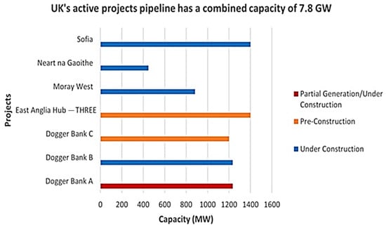 According to the results, the United Kingdom (UK) reported a gradual increase in the number of OWFs installed between 2019 and 2023. As of 2023, the findings show that the UK had a total of 2695 operational OWFs from 2766 that were operational in the previous year, 2022. In the same year, 2023, the operational OWFs in the UK generated approximately 15 gigawatts (GW) of wind capacity as compared to 14.77 that was recorded in the previous year. Further, the results show that the active wind installations in the country produced a combined capacity of 7.8 GW with the projects being either under construction, partial generation or under pre-construction. The total OW installations and the active projects are shown in Figure 1 and Figure 2, respectively.