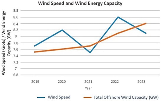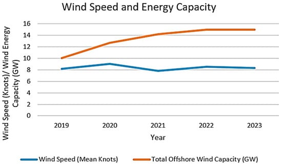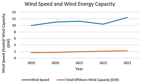 The bathymetric tidal current speed data and ocean currents for the five years are varied but within a mean range of 0.75–1.25 m/s. Also, in terms of wind speed, the UK reported varied values for the period of analysis, with the highest wind speed of 9 knots being recorded in 2020. Figure 3 shows a combined graphical visualization of the wind speed and wind energy capacity in the UK between 2019 and 2023.