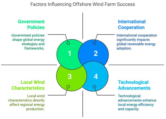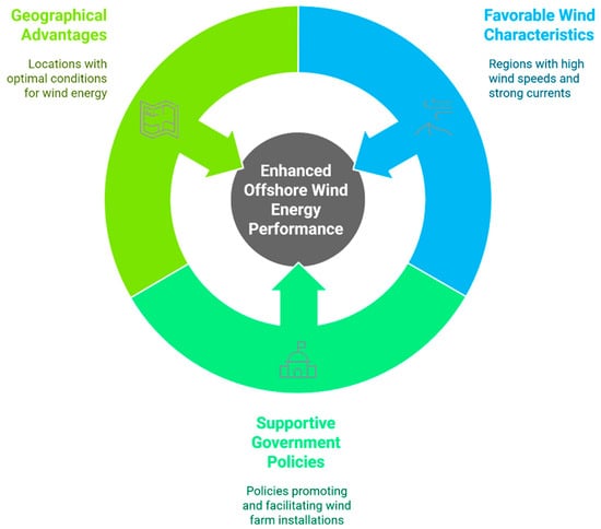 The OW energy performance of China is attributed to the favorable wind characteristics and government policies that promote the installation of OWF [,]. Therefore, the successful implementation of OW energy projects can be partially attributed to geographical factors and government policies as in the case of China. Apart from China, the study findings indicate that countries within locations with favorable wind characteristics and government policies such as the UK, Germany, Taiwan and Vietnam have reported increased activities related to OW energy. In Germany, for example, the active and operational wind energy farms are located in regions between the North and the Baltic Seas which experience high wind speeds and strong tidal currents that facilitate the production of OW energy [,,]. Also, the German government has removed subsidies for new OW which has accelerated the rise of new OW energy installations (see Figure 12) [,,]. The counter-intuitive acceleration of OWF installation growth in Germany following the removal of subsidies warrants a specific analysis of underlying market dynamics. This policy shift was not enacted in isolation but within a context of significant market maturity achieved through years of targeted support. Germany’s prior subsidized deployment phase, leveraging its favorable North and Baltic Sea geography, drove substantial technological learning, industrialization of the supply chain and economies of scale, drastically reducing the levelized cost of energy (LCOE). By the time direct subsidies were phased out, offshore wind in high-resource zones had attained commercial viability, capable of competing effectively via market mechanisms like power purchase agreements (PPAs) or competitive auctions. The removal of subsidies thus acted as a catalyst, signaling strong market confidence to investors and incentivizing the now-mature supply chain to achieve further cost efficiencies. This outcome underscores a critical transition point: in a highly mature market characterized by cost-competitiveness, robust infrastructure and deep investor experience, the withdrawal of direct price support can stimulate growth by leveraging market forces and established industrial capabilities. This contrasts sharply with emerging markets, like Taiwan, where continued policy support remains essential to bridge cost gaps, mitigate risks and foster the supply chain development necessary to unlock their geographical potential. Germany’s experience demonstrates that the effectiveness of specific policy instruments (like subsidy removal) is intrinsically linked to the developmental stage of the offshore wind sector. Figure 12 illustrates the significant role of favorable wind characteristics and supportive government policies in enhancing OW energy performance, particularly in China. The analysis reveals that successful OW projects are often linked to geographical advantages, as seen in countries like the UK, Germany, Taiwan and Vietnam. For instance, Germany’s OWFs, located between the North and Baltic Seas, benefit from high wind speeds and strong tidal currents, which are critical for energy production. Additionally, the German government’s policy changes, including the removal of subsidies for new OW projects, have spurred an increase in installations. This figure encapsulates the interconnectedness of geographical factors and government initiatives in driving the growth of OW energy across various nations.
