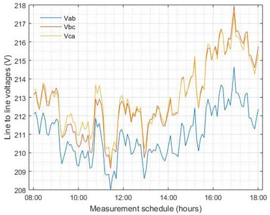 Measurements from the energy analyzer indicate that the line voltage supplied to the UDI remains within the acceptable ±10% tolerance. As shown in Figure 2, the minimum voltage recorded was 208.01 V (94.55% of the nominal 220 V), and the maximum was 217.96 V (99.07%). A slight overload was observed in Phase B, likely due to uneven distribution of single-phase loads or varying load operation, resulting in a neutral current profile like that of Phase B.