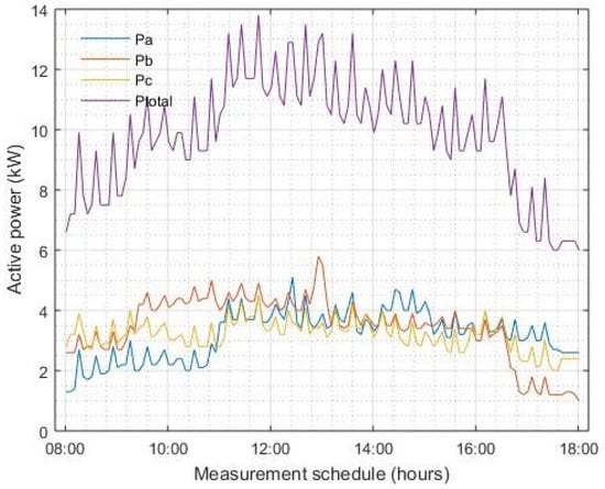 According to Figure 3, the maximum power consumption occurred at 11:46 a.m., reaching 13,800 W, coinciding with peak activity hours. Even during low-demand periods, a baseline consumption of 6000 W was recorded, indicating consistently high energy use. As suggested in [30], installing sub-meters in different facility areas could help track energy costs, identify inefficiencies, and optimize usage. Additionally, adjusting schedules and space availability could help reduce peak demand.