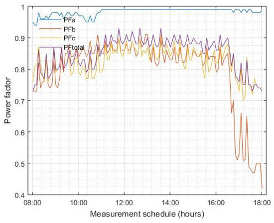 As shown in Figure 4, the average power factor at UDI is 84.80%, below the 90% threshold set by the CFE. Falling below this threshold can result in penalties of up to 120% of the energy cost. In this case, the estimated penalty is 3.67%, equivalent to approximately USD 111.76 per year [31]. The low power factor is primarily due to the high number of electronic devices, which distort the current waveform and reduce efficiency.