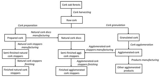 The Catalan cork industry is primarily located in the northeast of Catalonia, between the Costa Brava and the Catalan Pyrenees. At the time of this study, it was composed of 30 small and medium-sized enterprises [38]. These companies operate at different stages of the cork product value chain: cork harvesting, cork preparation, cork granulation, production of natural cork stoppers, natural cork discs, agglomerated cork stoppers, and other agglomerated products. The harvested cork is processed by the industry and undergoes various treatments depending on its quality and the final products to be manufactured [39]. The primary objective of industrial cork production is to produce natural cork products, which have higher economic value. Agglomerated cork products are typically made from the by-products of natural cork manufacturing or from lower-quality cork material. Figure 1 presents a schematic flow chart of the processes carried out by the Catalan cork industry.