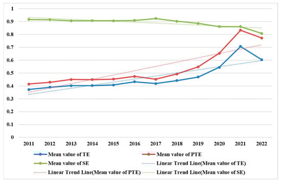 In this study, arable land area—commonly regarded as a critical input variable in agricultural efficiency analysis—was intentionally excluded for several reasons. First, land use costs account for a relatively small proportion of total agricultural production expenses in China. For instance, in Jinzhai County, Anhui Province, a mid-level economy region, the annual land rental cost for crop cultivation was as low as 100 RMB per mu in 2022, equivalent to merely 1500 RMB per hectare per year [54]. Second, there exists considerable regional variation across China’s 31 provinces. In northern regions, only one crop cycle per year is typical, whereas southern regions may support up to three cropping cycles annually. Moreover, for provinces where animal husbandry dominates, arable land is less relevant than pasture or feeding land. Third, data availability poses challenges. Official statistics on agricultural land, including arable land, are often incomplete or discontinuous, with changes in statistical definitions over time. For example, the 2012 China Rural Statistical Yearbook reports agricultural land data from as early as 2008 across many regions.