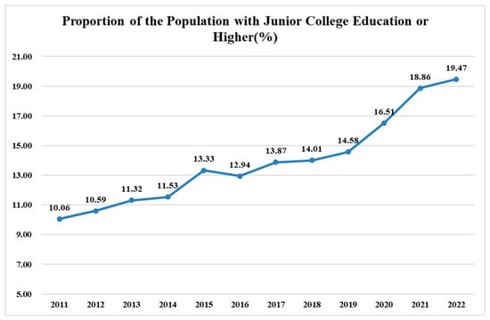 - Proportion of the Population with Junior College Education or Higher (%), which is based on a survey of the population aged six and above across 31 provinces, with typical sampling rates around 1% in different years. This variable represents the influence of urbanization on the educational level of residents, indicating higher proportions of individuals with at least junior college education in more urbanized provinces.