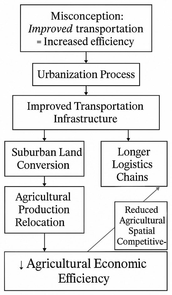 First, demographic urbanization reallocates rural surplus labor to urban areas, potentially enhancing agricultural productivity by reducing labor redundancy. However, in the absence of mechanization or labor substitution, this may lead to labor shortages and reduced agricultural output. Second, spatial urbanization, often characterized by the conversion of farmland into urban land—particularly in peri-urban zones—can constrain high-efficiency agricultural production, exacerbate land fragmentation, and increase logistical distances and costs, thus undermining economic efficiency in agriculture. Third, economic urbanization, through improvements in infrastructure, digital connectivity, and public services, may enhance agricultural performance if such benefits effectively diffuse into rural areas. If not, the result may be widened rural–urban disparities and weakened agricultural competitiveness.